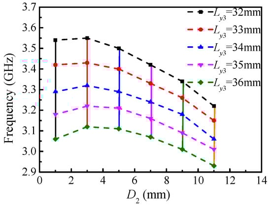 In addition, as indicated in Table 1, the most difference between traditional and optimized antennas lies in the length of parasitic element and distance from it to the driven one. In this context, the relationship between the occurring frequency of lower radiation null and the spacing from reflector to driven element D2, as well as the length of reflector Ly3 are selected for investigation and shown in Figure 7. It can be found that when D2 remains unchanged, increasing Ly3 will move down the frequency location of radiation null. Moreover, with a fixed Ly3, increasing D2 can also result in a variation of the frequency of radiation null. Herein, according to the above discussions, both the length of the parasitic element and the distance from the driven element to parasitic one in Yagi structure has been properly selected to obtain good gain selectivity for better filtering performance.