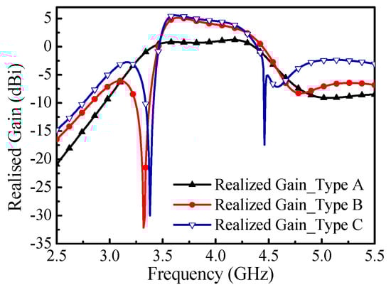 To further improve the suppression in the upper stopband, a pair of U-shaped resonators are deployed and directly coupled to the CPS feedline. Until now, the implementation of wideband Yagi dipole filtering antenna—i.e., antenna type C—is finally accomplished, as shown in Figure 8b. Figure 9 depicts its realized gain. It is found that one additional radiation null has been achieved at the near edge of operating frequency band, thus manifesting an improved gain selectivity than the one caused by the reflector. Herein, the introduced U-shaped folded line functions as an open-circuited half-wavelength resonator corresponding to a specific frequency; thus, signals at this frequency cannot pass through the feedline but couple to the U-shaped resonator. One thing should be mentioned that the U-shaped folded line is not same as those reported structures with notch since ground is nonexistent. The introduced U-shaped line radiates here and works just like a folded dipole antenna, which possesses an omnidirectional radiation pattern. As such, the omnidirectional radiation caused by U-shaped line worsens the front-to-back ratio, leading to an additional radiation null.