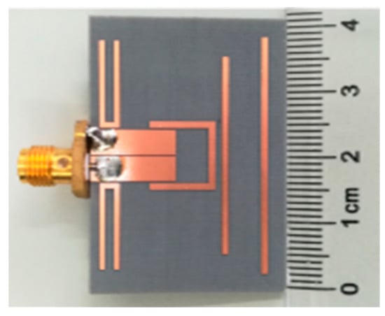 Figure 10 shows the photograph of fabricated antenna prototype. The dimensions of the antenna prototype are: W1 = 3.8 mm, W2 = 1 mm, W3 = 0.8 mm, Wdri = 1 mm, Wref = 1 mm, L1 = 13 mm, L2 = 28.4 mm, L3 = 27.4 mm, L4 = 13 mm, Ldri = 30 mm, Lref = 36 mm, g1 = 0.2 mm, g2 = 0.3 mm, g3 = 5 mm, g4 = 1 mm, g5 = 5 mm, and g6 = 0.3 mm. The CPS feedline is achieved by a pair of parallel coupled lines which are respectively connected with the inner and outer conductor of SMA, thus forming a balun structure. Besides, the flange of SMA is selected with a compact size for reducing its influence on radiation. The proposed antenna is easily fabricated and assembled.