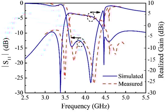 Measured and simulated reflection coefficients and realized gains of the fabricated antenna prototype.
