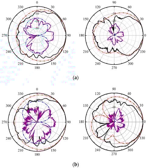 Measured and simulated radiation patterns of fabricated antenna prototype operating at (a) 3.66 GHz. (b) 4.13 GHz.