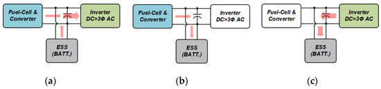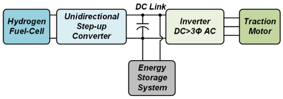 The structure of the propulsion system of the hydrogen fuel-cell hybrid railroad vehicle is shown in Figure 1. A hydrogen fuel-cell has a unidirectional energy source characteristic and has a relatively low voltage level and high energy density compared to other energy storage devices. Accordingly, the power generated from the hydrogen fuel-cell is supplied to the traction motor through the boost converter. The ESS, which is directly connected to the DC-link of the propulsion inverter, provides the stored energy to the traction motor when powering (or accelerating) and stores the regenerated energy from the motor when braking. The propulsion inverter performs the role of traction motor control through the driving of the switches.