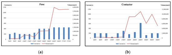 As the voltage of the battery pack is increased, it is essential to select components in consideration of the increased voltage rating when selecting the components constituting the rack unit or pack unit system. These components are fuse and contactor parts. Figure 4 shows the volume of commercial fuse and contactor according to voltage ratings and current ratings. As shown in Figure 4, both fuses and contactors have a feature that increases volume by more than two times with respect to a 2000 V voltage level that lowers the power density of the system. Therefore, it is necessary to consider these effects when designing the voltage levels of battery packs.
