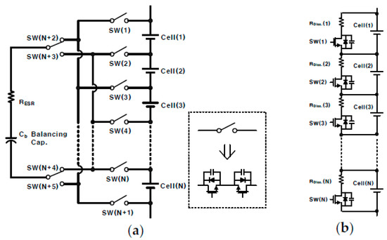 The cell-balancing methods applicable to battery packs include an ACB method and a PCB method [15]. PCB is a method of balancing the voltage of cells in a series by dissipating the energy of a cell with a relatively high SOC with a parallel-connected resistor. This method shows low power efficiency because it balances the charge of the cells by consuming energy [16]. However, it has the advantage that it can be configured by simply connecting one resistor and one switch to each cell. The ACB method delivers energy from the cell with a high SOC to the cell with a low SOC, and it has the advantage of having theoretically no energy consumption during the balancing process. However, the ACB method has a disadvantage in that bulky converter circuits are required for transferring the energy from the high SOC cell to the low SOC cell; thus, the complexity and price of the system are increased. Figure 5 shows the circuit diagram of the ACB method and the PCB method. The ACB scheme shown in Figure 5a is a single-switched capacitor-type ACB circuit that has a relatively simple structure among various ACB circuits [17]. Cell-balancing is achieved through the balancing capacitor and on/off operations of the switches connected to each cell. The capacitor is connected to the cell with a high SOC to charge energy and then it is connected to the cell with a low SOC to transfer the charged energy [18]. The PCB circuit shown in Figure 5b balances the SOC deviation by consuming more energy from over-charged cells compared to the under-charged cells by adjusting the turn-on time of switches connected in parallel to each cell. The abovementioned two different balancing methods are analyzed in this chapter.