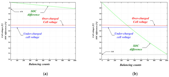 Trends of the cell voltages and the SOC differences with 1000 balancing cycles: (a) 100 mF balancing capacitor; (b) 1 F balancing capacitor.