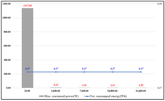 The PCB method balances the SOC differences of the cells by dissipation of over-charged cell energy using the parallel-connected resistor. It shows more loss than the ACB method, but it is more widely used in industry due to its simple structure and excellent overall system stability. Figure 5b shows a shunting resistor-type PCB circuit that connects a “switch-resistance” configuration in parallel to each series cell. In this circuit, the required number of resistors and switches varies linearly with the configuration of the series cell. When “n” series cells are configured, “n” resistors and “n” unidirectional switches are required. In the case of the PCB circuit, the energy of the over-charged cell is consumed by the resistance until the SOC deviation reaches the normal range. Therefore, the consumed energy is not affected by the balancing time. However, the instantaneous amount of power consumed by the discharge resistor is changed depending on the discharge time. The shorter the discharge time, the greater the maximum power consumed by the discharge resistor. This results in an increase in the size of the discharge resistor. Table 6 shows the maximum consumed power, total energy loss and balancing current value of each cell according to balancing time when the PCB method is applied. The balancing resistor, the maximum consumed power and the balancing current per cell were calculated using Equations (6) and (7). Samsung SDI 21700-30T lithium-ion rechargeable cells were used in the analysis. The specifications of the cell are shown in Table 7 and the power and energy loss comparisons with balancing time is shown in Figure 7.