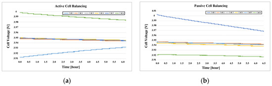 To compare the cell-balancing method of the battery pack for railroad vehicles, we selected the balancing conditions shown in Table 4. The initiating and terminating condition of cell-balancing was determined by the manufacturer’s general standard [15]. The cell-balancing would be started when the State-of-Charge (SOC) difference between cells is over 5% and would be terminated under 3%. The SOC is obtained from the cumulative current by time using the Ampere-hour counting method. The SOC can be calculated as below: