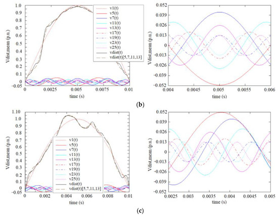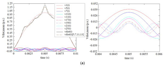 From the applicative viewpoint, a first novelty compared to previous papers is the treatment of both the 5th, 7th, 11th, 13th voltage harmonics already studied in [9], and of the 17th, 19th, 23rd, 25th, tackled here for the first time. Such harmonics are characteristic of 6-pulse—some of them of 12-pulse—alternating/direct current (AC/DC) converters; they play a major role, since are not only the highest in the spectra of voltage and current harmonics typically measured at the bus-bars of MV/LV grids [31,32], but also those for which Standards IEC 61000 and EN50160 set limits [2,3,4].