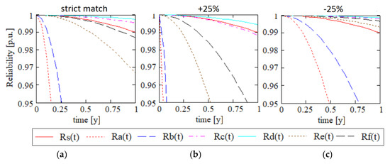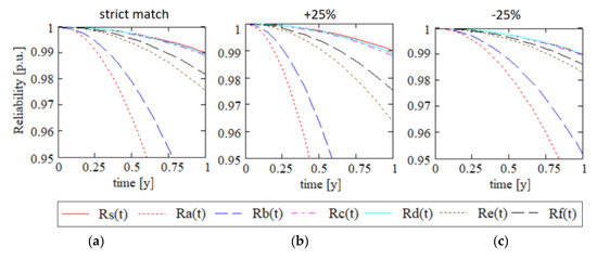 Case studies (g)–(l) in Table 3 and Table 4 show that this effect can really occur. Indeed, for the treated components all values of failure times and reliability increase significantly in case studies (g)–(l) with respect to their homologous values in case studies (a)–(f). In particular, the 1st percentile of time to failure rises by a factor —compare Equation (36) with Equation (38)—which is ≈4.4 for the cable and the capacitor, ≈4.5 for the motor and the transformer: thus this factor is quite similar for all treated components, since the relevant values of B are quite close (see Table 2). However, being times to failure at <Δθtot> = 0 °C the highest for the capacitor, the least for the cable, intermediate for the motor and the transformer, the increase involved by <Δθtot> = −15 °C leads to:
