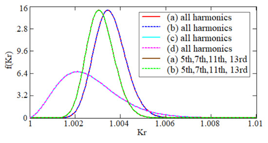 Equations (7)–(9) clearly demonstrate that, when nominal sinusoidal voltage is applied, the three voltage waveshape factors are equal to unity, namely Kp = Kw = Kr = 1. By contrast, when N voltage harmonics are superimposed onto nominal sinusoidal voltage, it is observed that:
