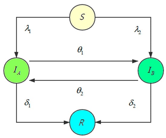 In Formulas (2)–(5), and , respectively, represent the number of nodes in the IA-state and IB-state. In Formula (2), the node in IA-state will be affected by the node in IB-state, and will be affected by the abandonment rate of type A information. In Formula (5), the node in IB-state will be affected by the node in IA-state, and will be affected by the abandonment rate of type B information. In Formulas (3)–(4), the transition between two states of the node is affected by the other state.