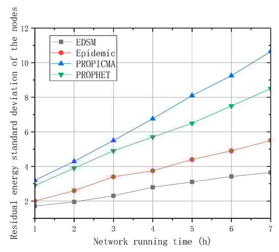 It can be seen from Figure 2 that, as the network running time increases, the residual energy standard deviation of the nodes of different algorithms increases. The residual energy standard deviation in the nodes of the EDSM is the smallest, indicating that the remaining energy distribution of the nodes of the EDSM is more uniform. This is because EDSM combines the status of the current node in routing, so that the delivered message conforms to the current trend. It can select different messages in a timely manner for forwarding according to the node status and the importance measure value.
