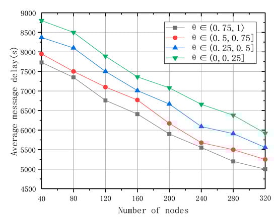 Figure 3 shows the average message delay of EDSM under a different number of nodes and different θ intervals. It can be seen from the graph that the average message delay of different θ intervals decreases with the increase in the number of nodes. The larger the value of θ, the lower the average message delay. This is because the greater the θ value, the greater the message importance measure, and the higher the priority in message forwarding and cache replacement. The average message delay of is 5%, 9.5% and 15% lower than that of , and , respectively.