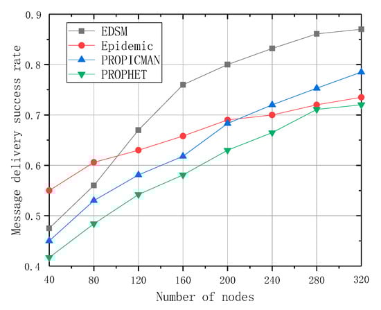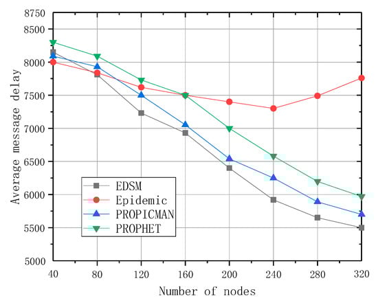 Figure 4 shows the success rate of message delivery for different numbers of nodes. It can be seen from the figure that EDSM has the highest message delivery success rate to a certain extent, while Epidemic is the highest at the beginning, but the growth is not obvious after the number of nodes reaches a certain level. This is because epidemics have the largest number of message copies and can achieve the best success rate when the number of nodes is small. When the number of nodes and copies in the network is too large, it will lead to cache space and excessive energy consumption, especially in the case of insufficient energy of some nodes. This will result in a reduction in the number of surviving nodes. When more nodes die in the network, the transmission success rate will be greatly reduced. This is determined by the characteristics of Epidemic. EDSM ‘s message delivery success rate increased by 13%, 18% and 12%, respectively, over PROPICMAN, PROPHET and Epidemic.