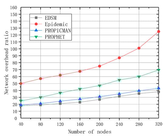 Figure 6 shows the network overhead ratio for different number of nodes. As can be seen from the graph, the network overhead ratio increases with the number of nodes. Epidemic has the high network overhead ratio and the most obvious upward trend. This is because Epidemic does not control the number of replicas of messages, which leads to high overhead. EDSM and PROPICMAN have little difference in network overhead ratio and both are relatively low. This is because these two algorithms effectively control the network overhead. EDSM’s network overhead ratio is 63% and 37% lower than that of Epidemic and PROPHET, respectively.