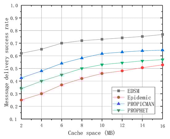 Figure 7 depicts the success rate of message delivery in different cache spaces. From the graph, we can see that the success rate of the message delivery of the four algorithms increases with the increase in buffer space, and the growth rate gets lower and lower. EDSM has the highest message delivery success rate.
