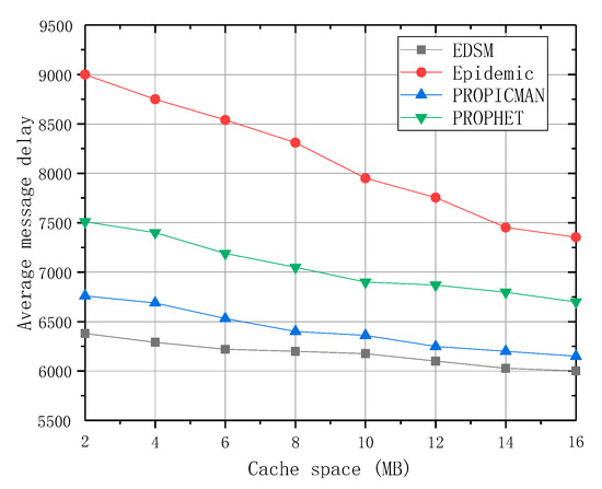 Figure 8 depicts the average message delay of different algorithms in different cache spaces. As can be seen from the graph, the average message delay decreases with the increase in buffer space. The Epidemic has the high average message delay, and the downward trend is most obvious. EDSM and PROPICMAN has the lowest average message delay and the change is gentle.
