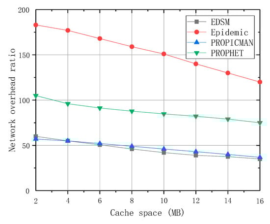 Figure 9 depicts the network overhead ratio in different cache spaces. With the increase in cache space, the network overhead ratio of the four algorithms decreases. Epidemic’s network overhead ratio has the most obvious downward trend. The network overhead ratio of EDSM and PROPICMAN is basically the same, and the downward trend is relatively stable.