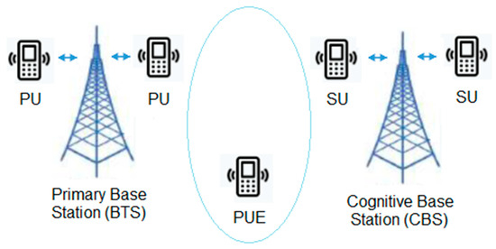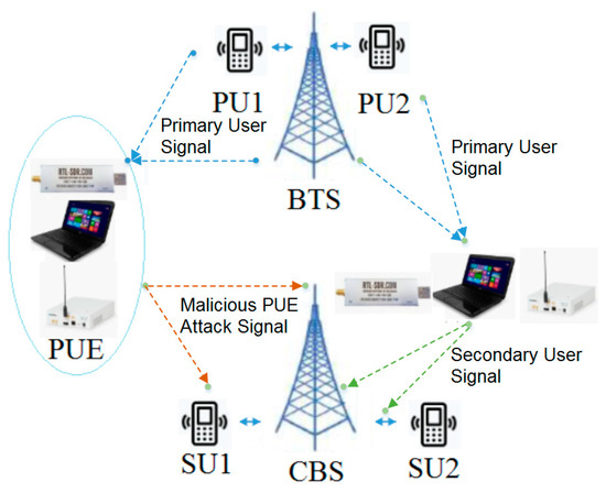 Primary network (BTS), mobile cognitive radio network (MCRN) (cognitive base station—CBS), users and primary user emulation (PUE) attack.