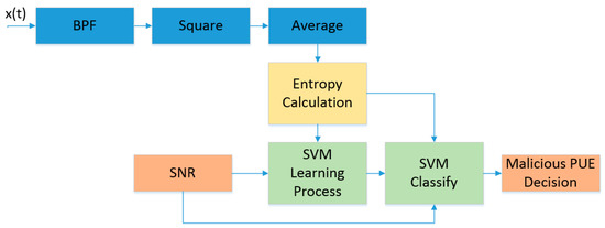 After the learning process, the algorithm calculates the hyperplane and vectors and is ready to classify the inputs. In the middle, part of the data is used to test the algorithm and measure the accuracy. The second part is to decide the presence of a malicious PUE. For this process, we made the energy detection and entropy calculation so that it is capable of identifying the signal. These values are the inputs for the SVM classification system and, according to the database and the algorithm of the SVM, it is decided if the presence is a PUE or not. This is shown in Figure 2 as the SVM classification process.