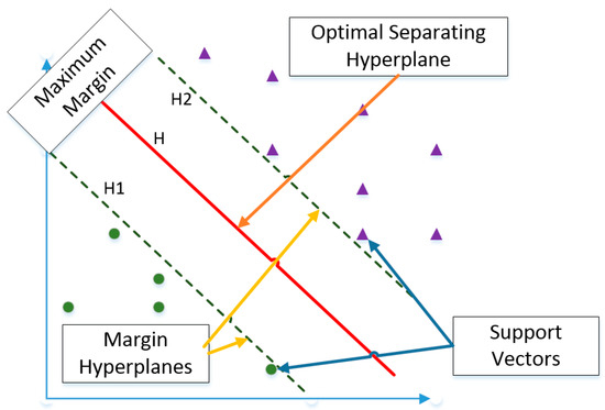 In Figure 3, assuming H as the optimal hyperplane, H1 and H2 are the two support planes chosen by the support vectors parallel to H. The margin is defined as the distance between the two support planes. To make the classification, we have to separate the two classes of data by maximizing the margin so that the hyperplane divides the two classes of data [23]. The hyperplane can be defined as Equation (1).