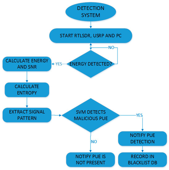 In the detection process, the program receives these data, and with the previous knowledge of signals, the SVM decides if there is a malicious PUE present in the system using scikit [32]. This can be seen in the flowchart in Figure 5.
