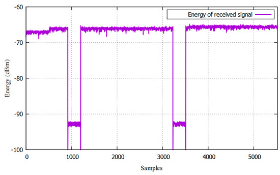 We calculate the energy of the signal using the RTLSDR, and these data are transmitted to the PC where there are on average 100 samples. The results for the GMSK signal can be seen in Figure 6, where a periodic pattern can be seen in time. These results show that the energy of the modulated signal is not constant in time. If we take the energy in a time that is low (under −90 dBm), the results will have a wrong interpretation, thus, we calculate the entropy of the averaged energy signal according to [34].