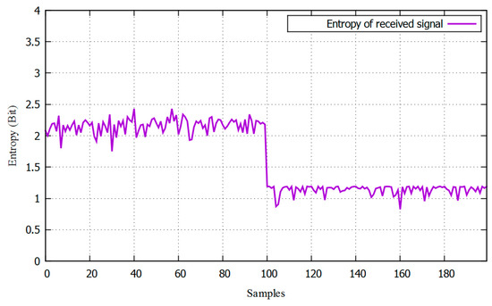 The next step is to calculate the entropy of the received energy signal. There are two stages: in the first one, there is only a noise signal; the second one is where a PUE attacks. These signals are processed and the entropy of the averaged energy received is calculated, as can be seen in Figure 7. The idea to use entropy to classify the signals is explained is this figure. The first 100 samples are the calculation of entropy in the absence of a malicious PUE signal, while the rest of the samples are taken when a modulated PU signal is present in the frequency. This is how the system detects the PUE attack.