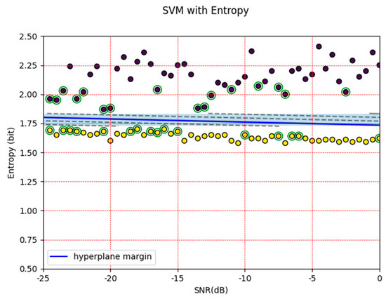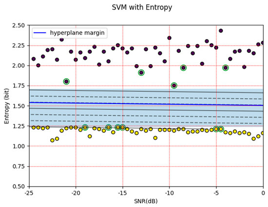 The SVM machine is implemented with these entropy values and the hyperplane and support vector are calculated by using the learning process, as can be seen in Figure 11. Notably, the margin is smaller than the GMSK signal. If a simple energy detector or entropy detector is used based on a threshold, the results will increase false alarm results, but with the SVM, the results are better for low SNR values and it is able to detect malicious PUE.