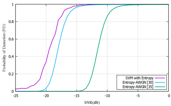 We take 10,000 samples for different SNRs and energy values with an objective Pfa of 0.1 [28]. With these values, we measure the practical probability of detection as the times of effective detection over all samples. As an example, we compare the entropy detector found in [30], and the objective PD of 90% is obtained −2 dB below the simple entropy detector, while it is −9 dB below the entropy detector used in [35]. Figure 9 shows this comparison, where an improvement in PD for low SNR values between −2 dB and −9 dB compared with entropy values from the literature can be seen. The detection system appears to work better than a simple entropy detector in low SNR values, and it detects malicious PUE properly.