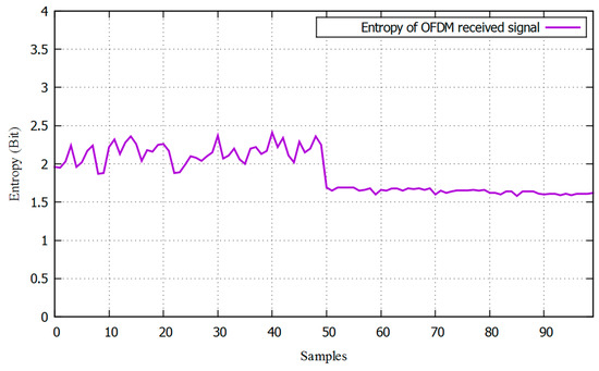 Entropy with and without of the orthogonal frequency division multiplexing (OFDM) signal.