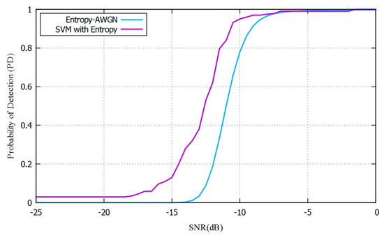 We apply the same process of GMSK, that is, we take 10,000 samples for different SNR and energy values with an objective PFA of 0.1 [28]. With these values, we measure the practical probability of detection as the times of effective detection over all samples. We compare these practical results with the entropy detector found in [30], and the objective PD of 90% is obtained −2 dB below the simple entropy detector. Figure 12 shows this comparison, where an improvement in PD for low SNR values compared with entropy values from the literature can be seen, which shows that the malicious PUE can be detected with high performance and effectiveness.