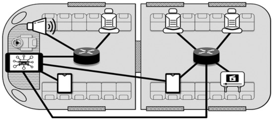 As described in Section 2, IVI users (owners or clients) may have different rights to control IVI devices, as per the user type. The IVI user can access the IVI master with the user’s smartphone and transmit a control message or data request message. The IVI master manages the information of the IVI devices by communicating with the IVI agent. Basically, the IVI master receives requests or information from the IVI device through the IVI agent. However, when there is a lot of data usage such as mass transfer or video streaming, the IVI master may communicate directly with the IVI device, not through the IVI agent. The IVI device refers to all devices inside the vehicle, such as sensors to check the vehicle status, navigation to help driving, a black box, and air-conditioners, heated-seats, and speakers within the vehicle. Figure 4 shows a possible configuration of A-IVI system components, based on Figure 3, in the example of public transportation vehicles.