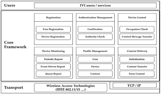 IVI functions are divided into six functional blocks: registration, authentication management, device control, device monitoring, profile management, and contents delivery, as shown in Figure 5.