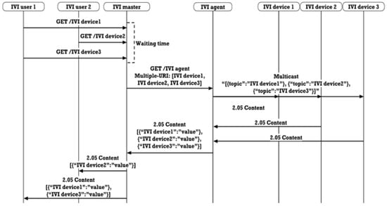 Figure 6 shows an operation flow of using the multiple URI mechanism. The multiple URI option is used to efficiently process messages in the following two situations. Firstly, multiple URI option is used to process the request message of the IVI user. The IVI user transmits various request messages for IVI device control to the IVI master. The IVI master does not immediately process the service request messages that are frequently used among these request messages. Instead, it will process those messages at a specific time. Then, messages to be delivered to IVI devices (managed by the same IVI agent) are transmitted as one packet including multiple URI. Secondly, the multiple URI option is used to process status messages that are periodically transmitted by the IVI device. The IVI device transmits a status report message to the IVI agent periodically, or when a change in status occurs. When the IVI agent periodically receives the message, it does not deliver the message to the IVI master. If a message indicating a change in status is received, it reports to the IVI master. The status report message is not transmitted immediately, but after a certain time has elapsed. All state change messages received during this period can be transmitted in one packet including the multiple URI option.