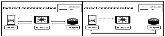 When a large amount of data are exchanged between IVI master and IVI agents in the indirect data communication, the data processing delay may increase rapidly and the traffic will be concentrated on the IVI master. In this case, the IVI user can directly communicate with the IVI agent without using the IVI master, as shown in Figure 14.