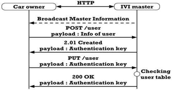 Figure 8 shows the operation flows of Car Owner registration. If there is no Car Owner information registered in the IVI master, the IVI master periodically broadcasts its Uniform Resource Locator (URL) information. The Car Owner who wants to register to the IVI master transmits a POST message including its information. After receiving the Car Owner’s information, the IVI master stores this information into its database and responds with an authentication key. The Car Owner transmits a message including the received authentication key to the IVI master. The IVI master confirms the received authentication key and sends the 200 OK response message so as to complete the Car Owner’s registration process.