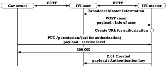 Figure 9 shows the registration process of the general users, not the Car Owner. IVI user first transmits a POST message to the IVI master. Then, the IVI master will create a URL for permission and waits for permission from the Car Owner. The Car Owner transmits an approval message including the service level of the corresponding IVI user to the generated URL. After that, the IVI master transmits a message including the authentication key to the IVI user. The IVI user who received the authentication key can log in by sending a PUT message to the IVI master along with the received authentication key.