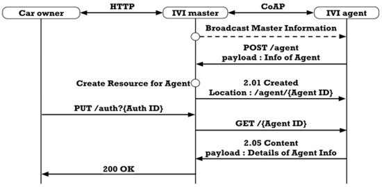 Figure 10 shows the IVI agent registration process. The IVI master periodically broadcasts its information. If an IVI agent receives this broadcast message, the agent sends a PUT message to the IVI master. The IVI master then stores the IVI agent information into its database and informs the Car Owner that there is an IVI agent to register. The Car Owner sends a POST message for requesting IVI agent registration to the IVI master. The IVI master creates a resource for IVI agent management and sends a GET message for requesting a detailed specification of the IVI agent. When the IVI master receives the updated information of the corresponding IVI agent, the message is delivered to the Car Owner, and the registration process is completed.