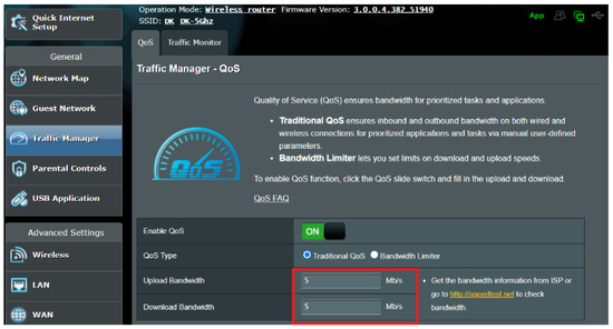 For various experimentations, the testbed network included three Wi-Fi access points (APs), which were connected via a star topology. We used an ASUS RT-AX56U as AP. The AP was connected to all IVI entities. The IVI master and IVI agent were connected with wires, whereas IVI device or IVI user can be connected by wireless media. In addition, all APs were connected by Local Area Network (LAN). Figure 16 shows an example of AP configuration, in which the bandwidth between APs was set to 5 Mbps. Two IVI agents in this testbed were connected to the APs. IVI users and IVI devices were also connected to APs using Wi-Fi.