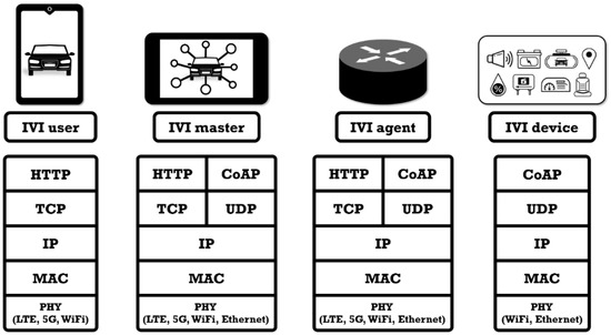 Figure 17 shows the IVI system entities for implementation. Figure 18 shows the protocol stack used for implementation of each entity in the proposed A-IVI scheme. The IVI user communicates with the other IVI entities using HTTP/TCP, whereas CoAP/UDP is used for communication among the IVI master, IVI agents, and IVI devices to support low-power devices and compatibility with the standard IoT frameworks. As shown in the figure, the IVI master must support both HTTP and CoAP to relay the IVI user’s requests to IVI devices. IVI agents must also support both HTTP and CoAP to perform direct communication with IVI users.