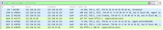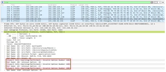 Figure 23 shows the packet capturing results for multiple URI communication, in which the IVI agent (IP: 192.168.126.1) receives a status change message from three IVI devices. After a certain time has elapsed, the IVI agent transmits three device status change information to the IVI master (IP: 155.230.36.152), with a single message including multiple URIs. We can see that the multiple URI message that the IVI agent delivers to the IVI master includes three or more URI-path options starting with “/”. In addition, we can see that the three options of type 100 are included together. Each field represents the length of data to be delivered to each URI.