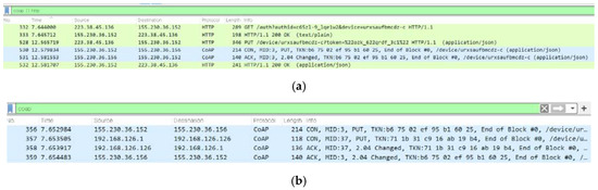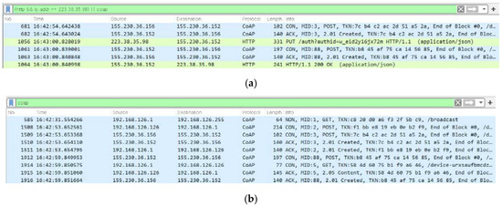Figure 20. Packet capturing results for IVI device registration process: (a) Packet capture for IVI master, (b) Packet capture for IVI agent.