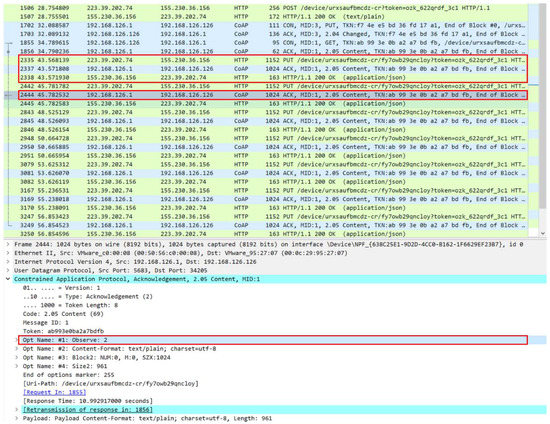 Figure 22 shows the packet capturing results for direct communication between IVI users and IVI agents without using the IVI master. In the red box of Figure 20, we can see that the IVI user requests the IVI device information directly to the IVI agent through the PUT message. The packet information of packet number 2444 confirms that the CoAP observe message was used.