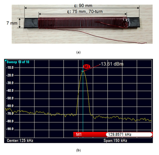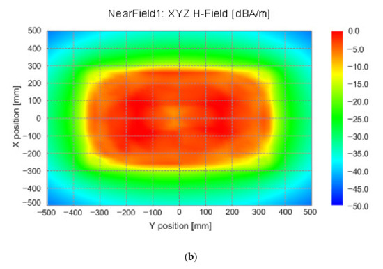 Figure 21b), the ferrite antenna received power of the primary device is −52.35 dBm for ferrite antenna (Rx1) located at the −y-direction and −65.25 dBm for ferrite antenna (Rx2) located at the +y-direction. This also indicates that the secondary device is on the right-side of the center alignment point of the primary device. Therefore, in vehicle-level testing, the secondary device is moved to the left. It can be confirmed that these results show the same tendencies as those of the simulation result, as shown in