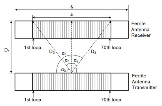 2 is the angle between the Nth loop of the ferrite antenna transmitter in the ±y-direction mounted on the secondary device and the 2nd to 70th loops of the ferrite antenna receiver in the ±y-direction mounted on the primary device, D
