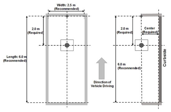 20]. The geometric center of the primary device shall be installed at the center of the width of the parking spot and 2 m from the inner of the line in front of the parking spot, as shown in