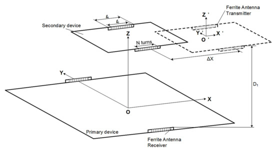 2 is the angle between the Nth loop of the ferrite antenna transmitter in the ±y-direction mounted on the secondary device and the 1st loop of the ferrite antenna receiver in the ±y-direction mounted on the primary device, D