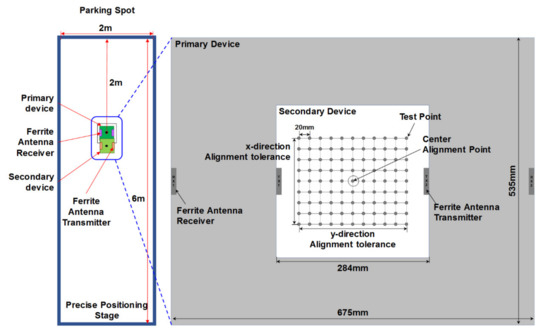 20]. It also focuses on technology that satisfies the fine positioning condition, where the central alignment distance between the primary and secondary devices is approximately 1.5 m or more and the precise positioning condition, where the primary and secondary devices begin to overlap. Among them, low power excitation (LPE) is a technology whose primary device, i.e., the power transfer device, performs fine and precise positioning by transmitting a minute quantity of power to the secondary device. Another method is to mount a ferrite antenna using a low frequency (LF) in primary device or a secondary device and perform fine and precise positioning using the magnetic field change value of the ferrite antenna. Therefore, LPE and ferrite antennas were applied to the SAE J2954 standard as a method for fine and precise positioning in an EV WPT system [