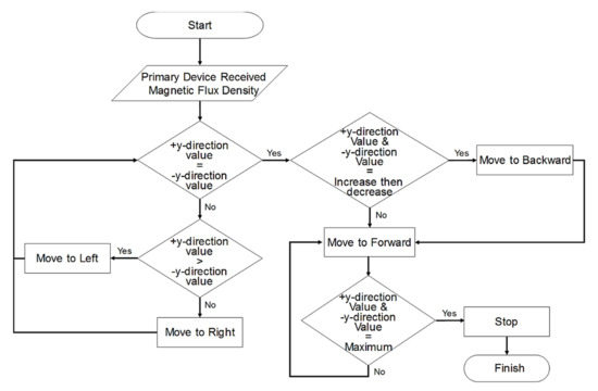 The sequence for finding the center alignment point of the primary device and secondary device using the ferrite antenna within the alignment tolerance area of the EV WPT system is proposed as follows: (i) The primary device’s ferrite antenna receiver is received magnetic flux density from the secondary device’s ferrite antenna transmitter; (ii) The primary device is compared to the received magnetic flux density in the +y- and −y-directions; (iii) If the magnetic flux density value in the +y-direction is greater than in the −y-direction, the secondary device is moved to the left. If the magnetic flux density value in the +y-direction is smaller than in the −y-direction, the secondary device is moved to the right. (iv) If the magnetic flux density value in the +y- and −y-direction was equaled, the secondary device is at the center of the width of the parking spot. (v) If the magnetic flux density value was equaled and has decreased after an increase, the secondary device is moved to the backward because it has already passed the center alignment point of the primary device. (vi) If the magnetic flux density value was equaled, but has not decreased after an increase, the secondary device is moved to the forward because the secondary device has not reached the center alignment point of the primary device. (vii) If the magnetic flux density value in the +y- and −y-direction is the maximum, the secondary device is stopped because it has reached the center alignment point of the primary device. The sequence for finding the center alignment point within the alignment tolerance area is shown in